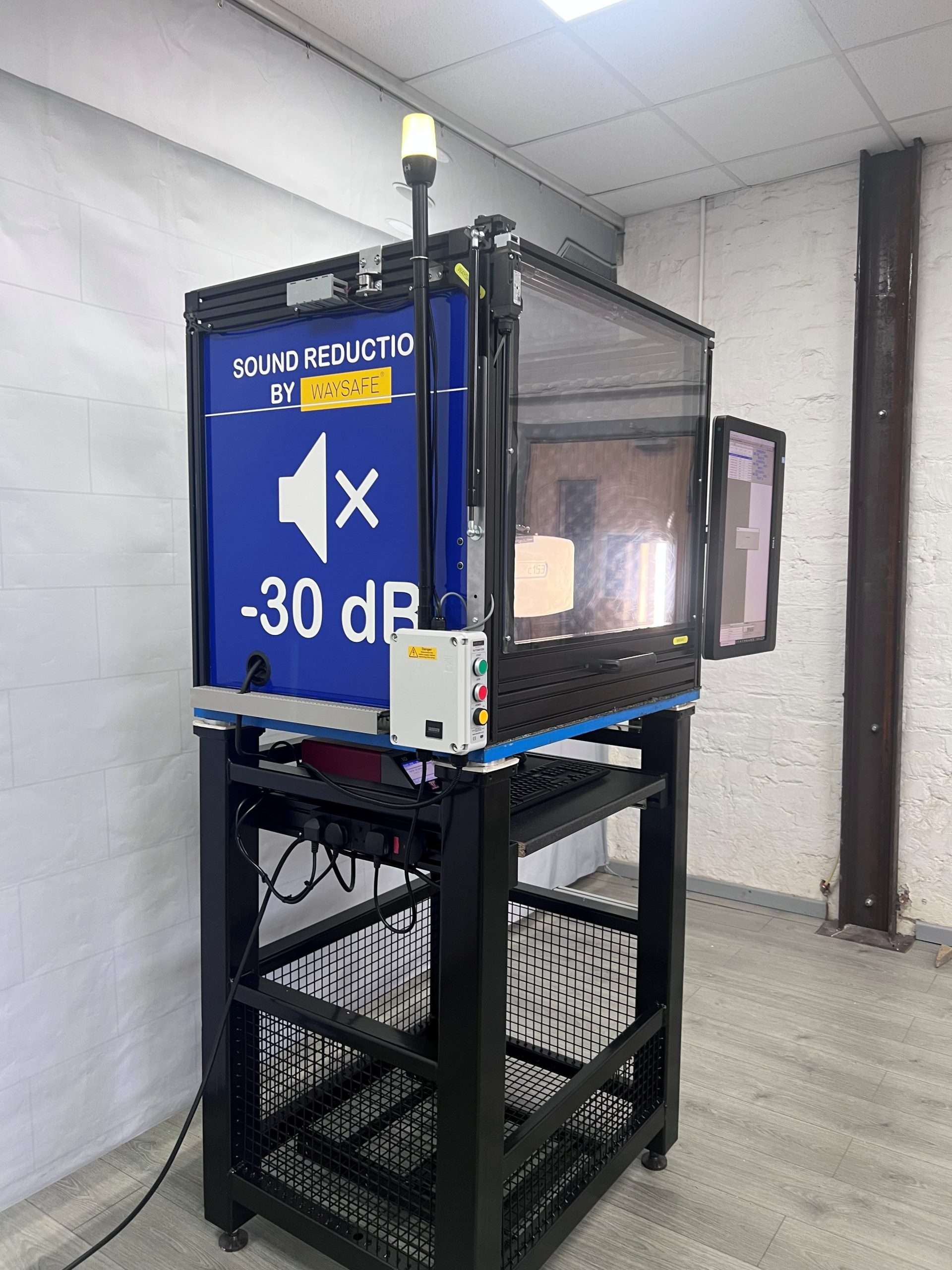 The primary objective was to reduce the noise generated by the dot peen machine to ensure a safe and comfortable working environment for the operators, without compromising the machine’s performance. The goal was to achieve a noise reduction of at least 25 decibels, bringing the sound level within recommended limits.